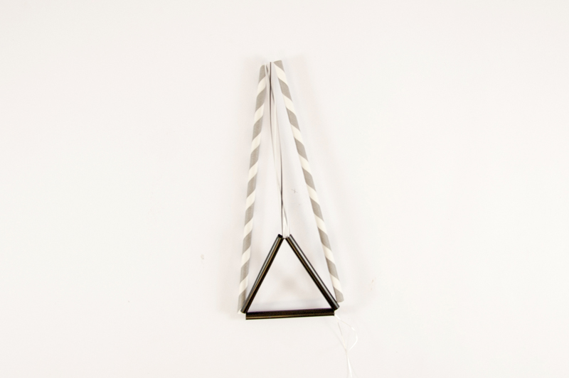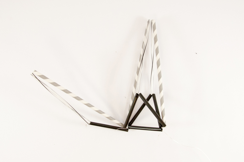 3. Jetzt beginnt das Zusammensetzen. Ziehe auf den Draht folgende Stücke auf: 7cm – 15 cm – 20 cm. Lege die Strohhalme zum Dreieck ziehe den Draht fest und verzwirbele den laufenden Draht mit dem Anfangsstück, das noch aus dem ersten Röhrchen herausschaut.