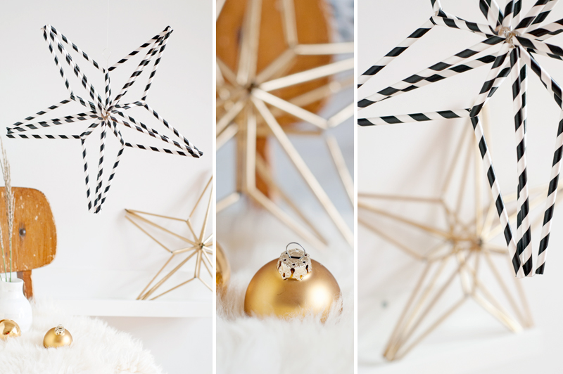 Heute gibt es zum Schwarz und Weiss auch noch einen Hauch Gold von mir! Und zwar in Form eines Himmeli-Sternes. Der wird ganz einfach aus Papier-Strohhalmen zusammengesetzt, dünner Draht im Inneren der Röhrchen hält alles zusammen.