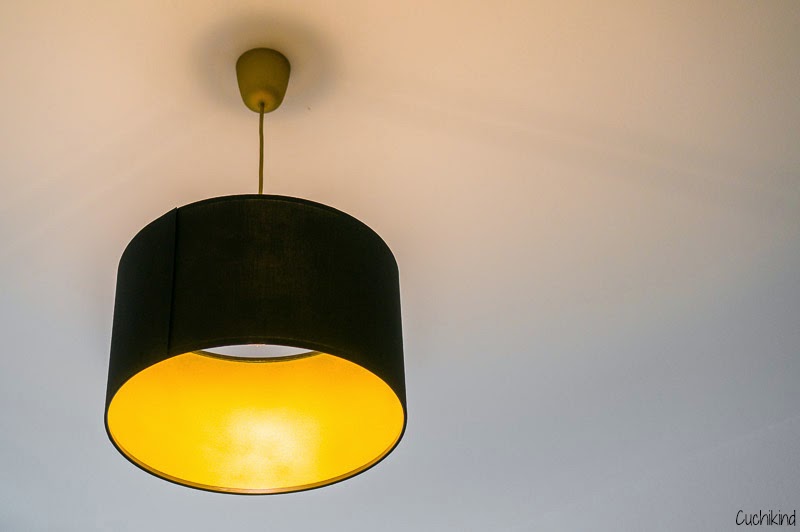 Also haben wir bei Ikea einfach einen schwarzen Lampenschirm gekauft und ihn innen mit Goldspray besprüht (vorher den Klettverschluss abkleben und etwas unterlegen!). Außerdem haben wir auch die Aufhängung mit eingesprüht, damit unser weißes Schlafzimmer mehr leuchtet. Die Idee habe ich hier gesehen, wir haben nur eine andere Lampe benutzt.