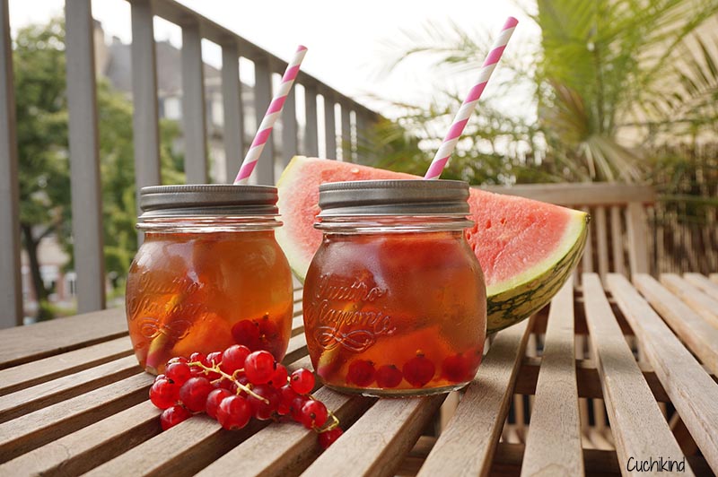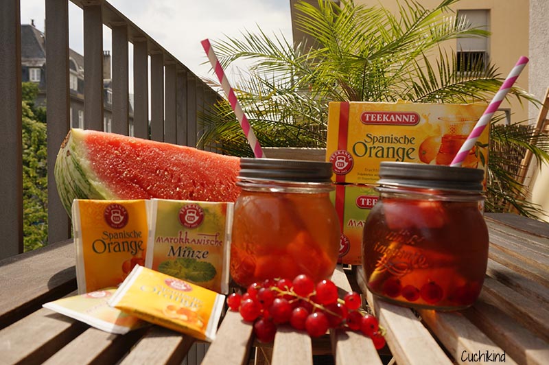 Rezept Nummer 2 ist total lecker und auch noch gesund, weil man es nicht süßen muss. Eigentlich reicht es schon, wenn ihr die beiden Sorten „Spanische Orange“ und „Marokkanische Minze“ von Teekanne mixt. Die beiden Sorten passen super zusammen und schmecken noch besser, wenn man wie hier auf dem Foto Wassermelone und/oder Johannisbeeren dazu gibt.