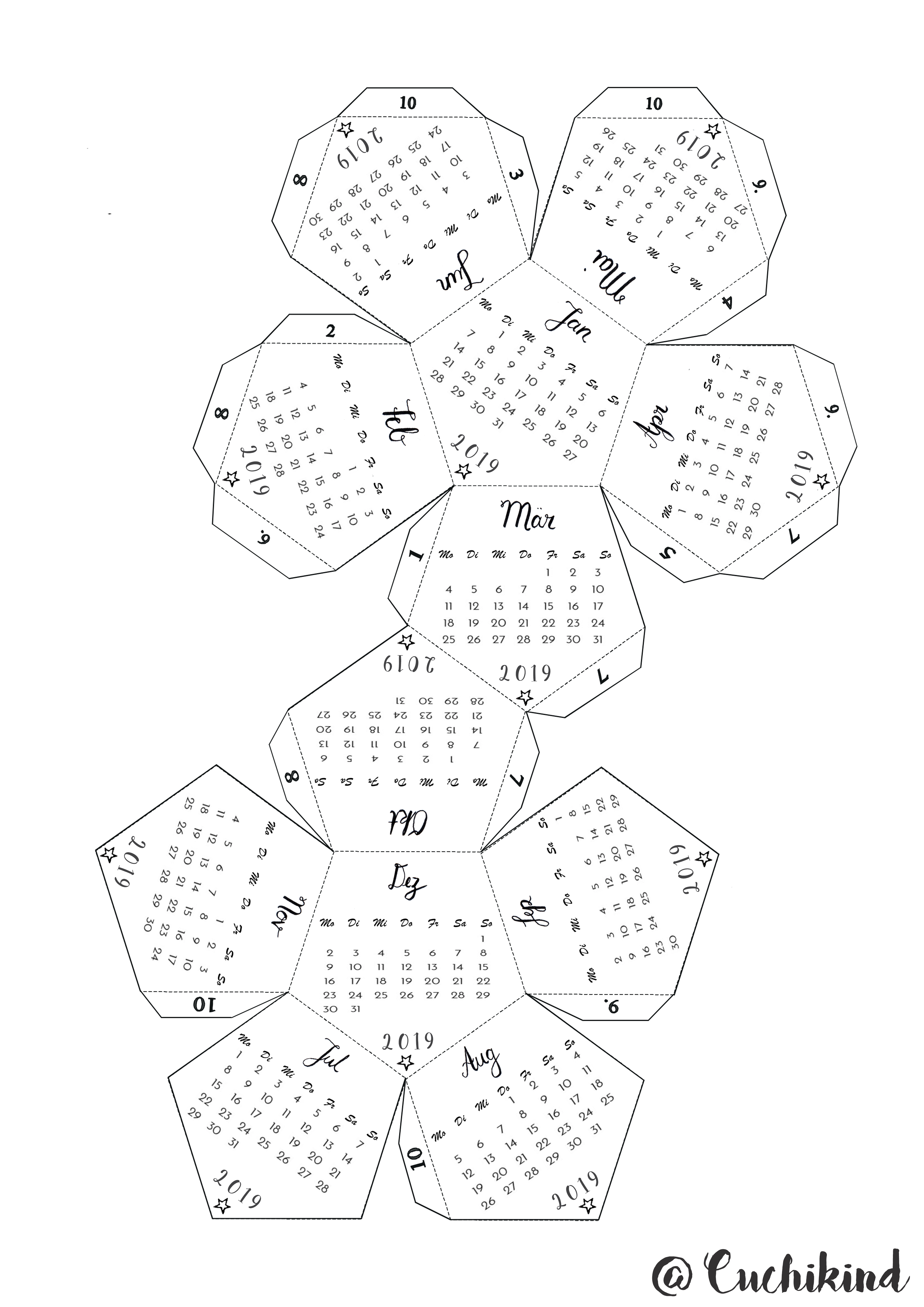 Es ist wieder so weit. Es gibt einen Kalender 2019 zum Ausdrucken. Natürlich ist das bei mir wie immer kein normaler Kalender, sondern ein ganz spezieller, mathematisch angehauchter. Meinen 3D-Kalender gibt es mittlerweile schon seit 5 Jahren und ich bekomme schon Wochen vorher immer Anfragen, wann er denn endlich online kommt. Das freut mich natürlich sehr, wenn ihr so große Freude daran habt. Der Dodekaeder, wie er richtig heißt, ist die perfekte Geschenkidee für die Eltern, Großeltern oder Freunde. Dieses Jahr gibt es drei Varianten und sogar ein Anleitungsvideo! Einmal die Handlettering-Version für die Großen, dann einen Kinderkalender ohne Tage und eine komplett leere Variante für die ganz Kreativen unter euch.