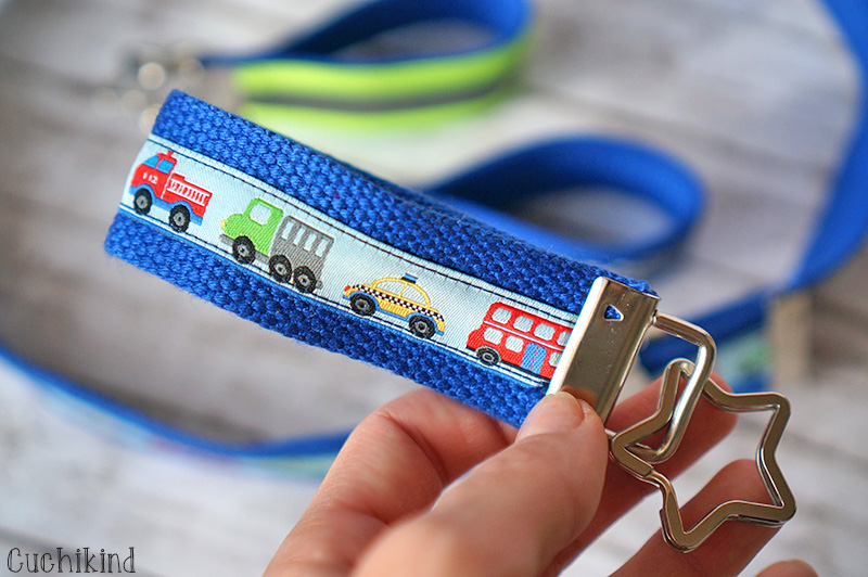 Die Schlüsselanhänger sind genauso schnell gemacht. Den Anhänger mit dem Reflektorband werden wir an Finns Rucksack oder seine Jacke hängen, damit man ihn im Dunkeln besser sieht. Mir ist aufgefallen, dass seine Kleidung hauptsächlich dunkelblau ist, was nicht wirklich zur Sichtbarkeit beiträgt.