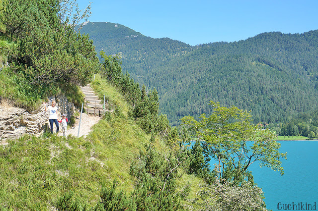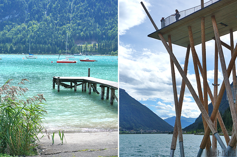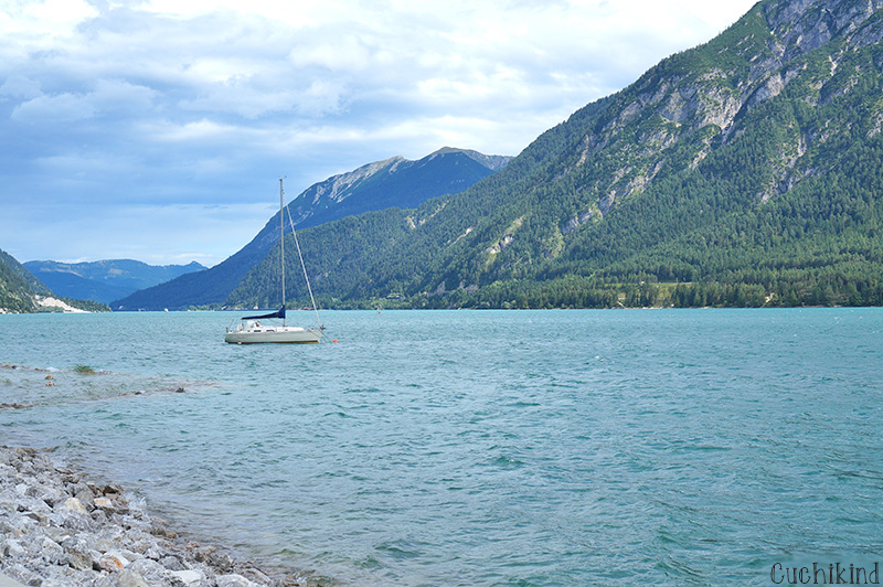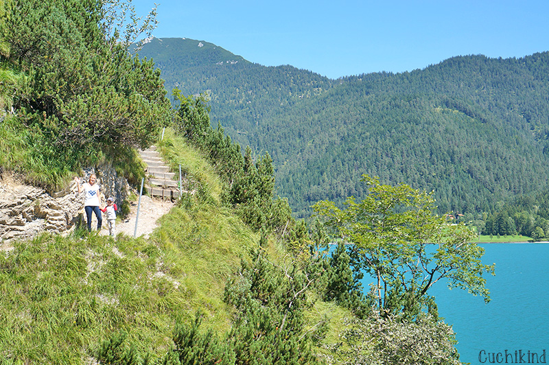 Es gibt aber auch tolle Angebote, die man rund um den Achensee machen kann, der so unglaublich schön ist, dass er auch irgendwo im Mittelmeer sein könnte. Türkisblaues, glasklares Wasser. Leider etwas zu kalt zum Baden, ich habe mich nur bis zum Bauchnabel reingetraut. Wir sind einmal mit dem Schiff komplett um den See gefahren und an einem superschönen Wanderweg ausgestiegen. Das ist die Gaisalm. Mit kleinen Kinder nur mit Kraxe machbar. Da wir leider keine dabei hatten, weil es total spontan war, dass wir überhaupt ausgestiegen sind, sind wir nur ein kleines Stück gegangen.