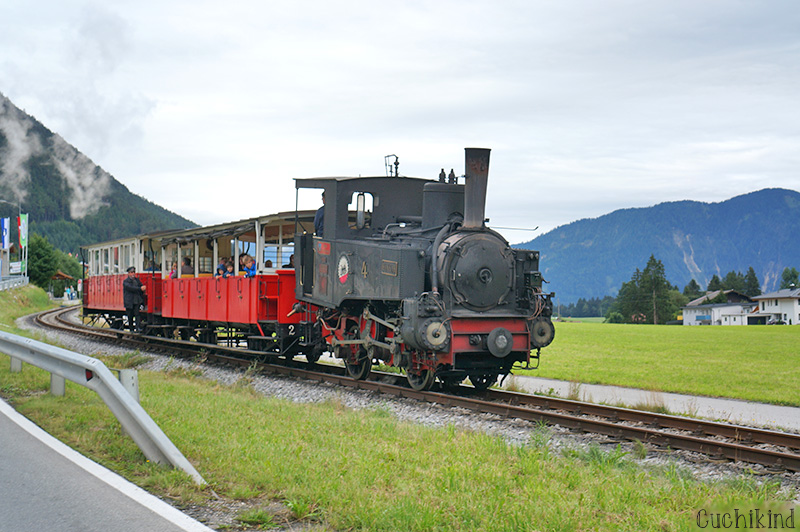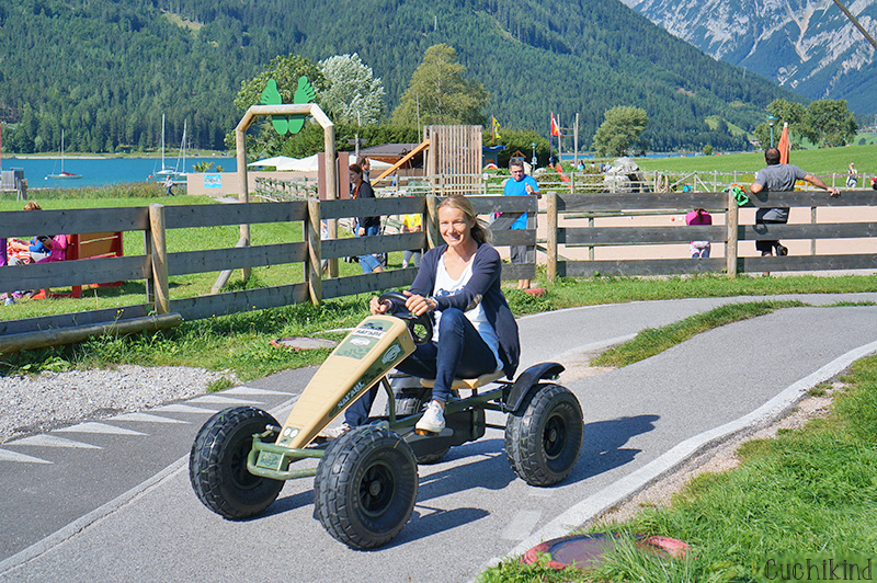 Außerdem gibt es eine Dampflok, die vom Achensee ins Tal fährt. Da es dort aber nichts Interessantes zu sehen geben soll und sie auch nicht gerade billig ist, sind wir nicht selbst mitgefahren. Mit den Rädern sind wir frühmorgens nach Pertisau ab auf den Berg. Das war für mich einer der schönsten Tage. Wir waren fast alleine, hatten traumhaftes Wetter und die Aussicht, ich sag’s euch. Die seht ihr übrigens auf dem ersten Foto. Einen Tag später haben wir uns wieder die coolen E-Bikes geliehen und sind zum Campingplatz am anderen Ende des Achensees gefahren. Hier gibt es einen tollen Wasser- und Abenteuerspielplatz.