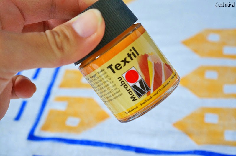 Marabu Textilfarben und Moosgummi gestempelt. Folgende Farben habe ich verwendet: Dunkelblau 053, Mandarine 225, Korallenrot 036, Hellgrün 062 und Hellblau 090. Die Farben sehen alle superschön aus, nur Hellblau ist ein bisschen blass.