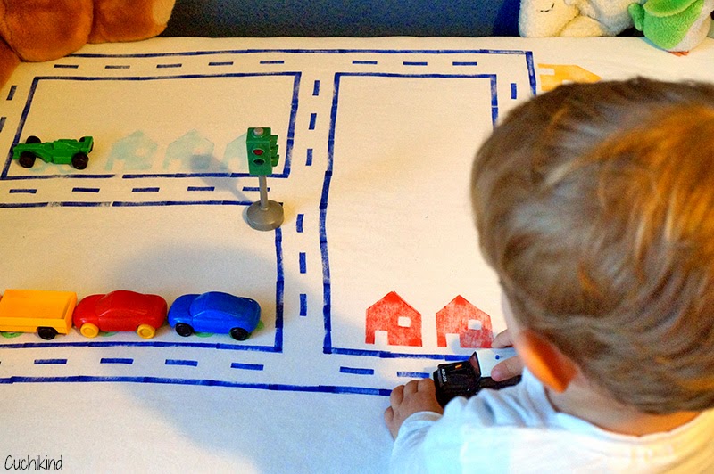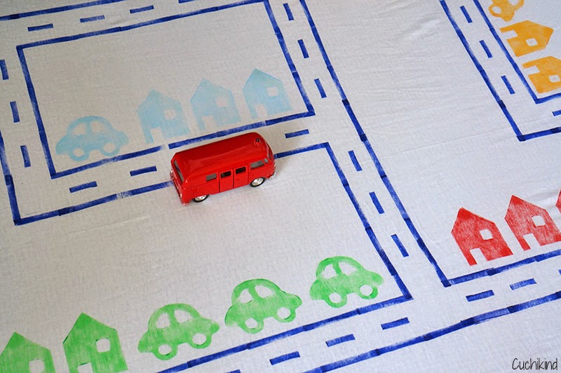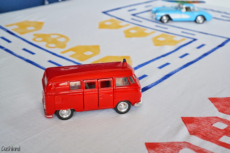 Guten Morgen ihr Lieben! Ihr könnt euch sicher noch daran erinnern, dass ich Finns Bettwäsche mit Autos bestempelt habe (hier) und erwähnte, dass ich keinen schönen Autoteppich gefunden habe. Macht nichts, ich stempele mir einfach meinen eigenen.