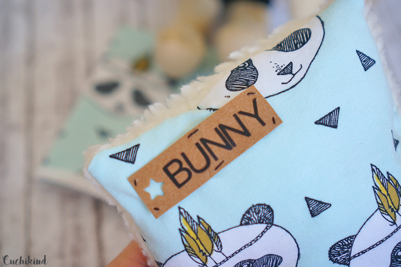 Das Label habe ich aus einem Stück SnapPap zurechtgeschnitten, es mit einem Mini-Sternenstanzer gelocht und an wenigen Stellen auf die Vorderseite des Kissens genäht. Zuletzt habe ich noch Buchstaben geplottet und aufgeklebt. Fertig war das kleine süße Kissen, das perfekt zur Decke des Lieblingshasen passt.