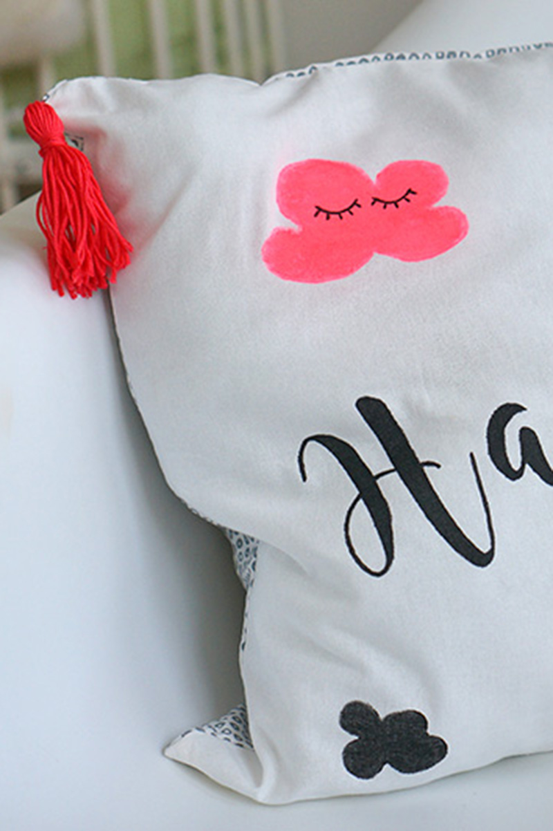 Die Quasten können jetzt an die beiden oberen Ecken des Kissens genäht werden. Fertig!