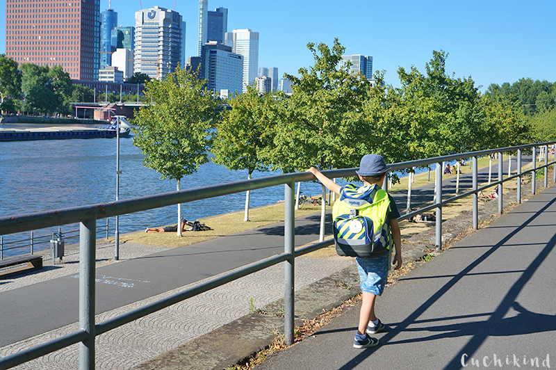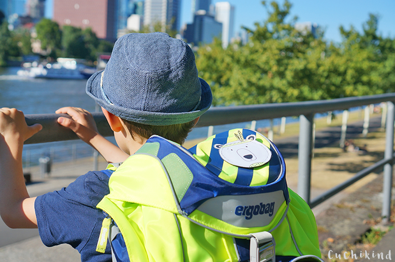 Also sind wir in einen Laden hier in Frankfurt, der nur Schulranzen verkauft und dementsprechend Ahnung hat. Ich muss zugeben, dass ich vorher schon einen Favoriten hatte, den ich auf der Straße bei einem anderen Kind gesehen habe. Aber ich wollte Finn selbst entscheiden lassen. Nur bei Starwars oder Ähnlichem hätte ich vielleicht eingegriffen. Aber soweit kam es Gott sei dank gar nicht. Er hat schon im Schaufenster genau den für toll befunden, den ich im Auge hatte. Wir haben uns in Ruhe mehrere Marken und Modelle angeschaut, waren uns aber schnell einig, dass es dieser von ergobag werden sollte.