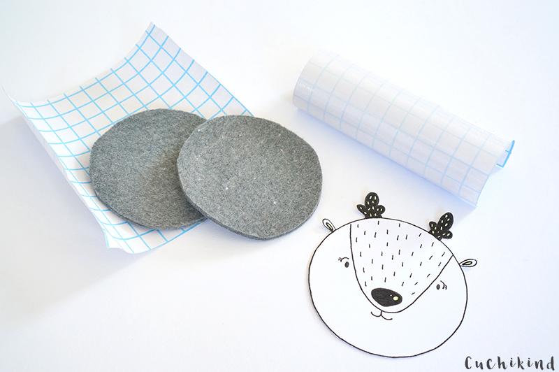 Aus dem dicken Filz schneidet ihr so viele Kreise wie ihr Figuren habt aus. Ihr könnt wieder den Klettie als Vorlage nutzen. Über die Tiergesichter klebt ihr durchsichtige Buchfolie und schneidet sie exakt ab.