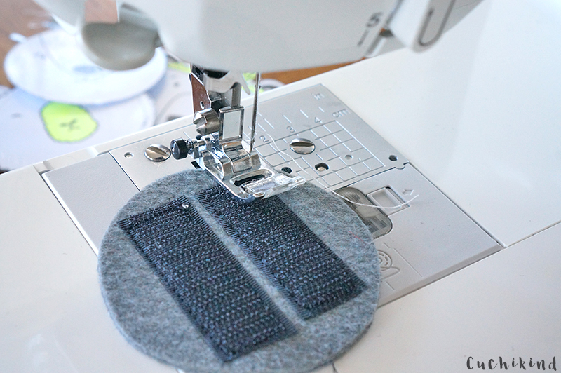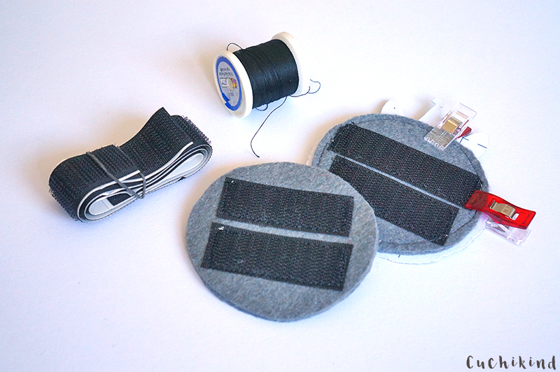 Ihr schneidet zwei Stücke Klettband (raue Seite) ab und legt oder klebt sie auf den Filz. Mit der Nähmaschine näht ihr beide noch gut an.