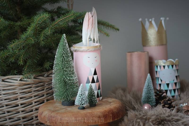 Die Rollenform habe ich dann mit schönem Geschenkpapier beklebt (mit herkömmlichen Stickkleber), danach könnt ihr die Rollenform nach herzenslust verzieren (zum Bekleben habe ich hier Heißkleber verwendet) Ich habe einen kleinen König und einen Indianer gestaltet, außerdem noch eine Rolle ohne Verzierung, die ich nur mit Geschenkpapier beklebt habe. Hier könnt ihr eurer Phantasie freien Lauf lassen und vielleicht auch themenbezogen passend zum Geschenk verzieren.