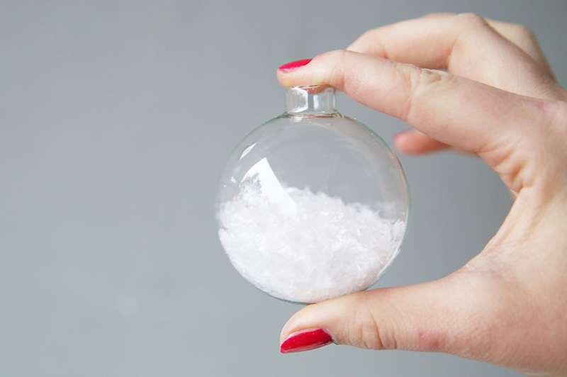 Entfernt zunächst die Kappe der Kugel und legt sie beiseite, sodass ihr die Kugel mit Kunstschnee füllen könnt. Die Kappe braucht ihr später wieder, um die Kugel zu schließen. Am besten geht das, wenn ihr eine kleine Schale mit Kunstschnee füllt und darin die Kugel platziert. Hier könnt ihr nach und nach die Schneeflocken einfüllen.