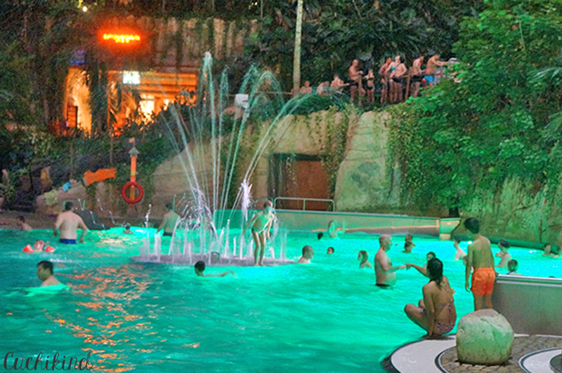 Puh, gar nicht so einfach, das sind nämlich echt viele. Im Kinderbereich gibt es zwei kleinere Pools, in denen die Kids mit Booten fahren können. Dann gibt es die Lagune mit Sand, Strudeln und zwei Rutschen, die durch den Berg führen. Die seht ihr oben auf dem Foto. Finn wollte hier die meiste Zeit sein, weil er stehen und schwimmen üben konnte. Das Wasser wechselt hier zu jeder Tageszeit die Farbe. Am Ende der Halle gibt es einen großen Strandbereich mit Babypool, Piratenschiff und tiefem Wasser. Außerdem gibt es einen Rutschenbereich für die größeren Kids. Seit 2016 gibt es den neuen Bereich Amazonia, der 35000qm umfasst. Besonders faszinierend ist die Wildwasserrutsche, die auch im Winter nach draußen führt.