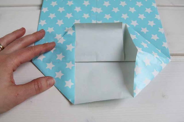 Die Seiten auseinanderziehen und an den Ecken einknicken. Dann die untere und obere Kante etwas überlappend in die Mitte falten und mit Tesafilm zusammen kleben. Wenn das Geschenk schwer ist, sollte man noch ein extra Stück Geschenkpapier oder Pappe auf den Boden kleben. Oder das Ganze auch von innen mit Tesafilm fixieren.