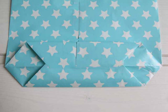 Das ganze funktioniert am besten mit festerem Geschenkpapier oder Tapetenresten. Wenn das Geschenkpapier dünn ist, am besten doppelt nehmen (dann ist auch die Innenseite der Tüte gemustert).  Man faltet das Geschenkpapier in der Mitte, dass es etwas überlappt und klebt es großzügig mit Tesafilm zusammen. Dann wird die untere Seite nach oben geklappt. Je größer die umgeklappte Fläche, desto größer wird der Boden der Tüte (je nach  Tiefe des Geschenkes bemessen).