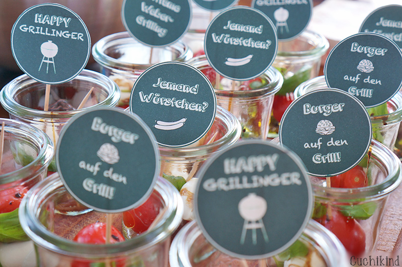 Die Dateien fügt ihr am besten in Word ein, druckt sie aus und schneidet die Kreise aus. Dann klebt ihr Zahnstocher mit Tesafilm dahinter. Die Weck-Gläschen der Gastgeber sind übrigens mit Tomate-Mozzarella-Kügelchen in Pesto gefüllt. Das sieht süß aus und ist total lecker.