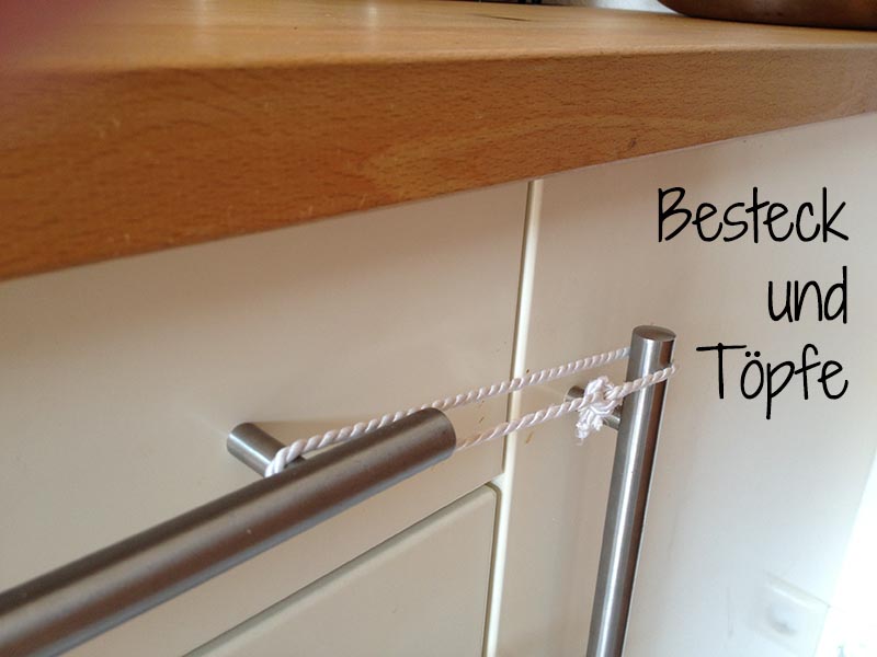 Das funktioniert natürlich nur, wenn man die passenden Griffe hat, die gibt es bei dem schwedischen Möbelhaus. Finn kann die Schränke nicht mehr öffnen, wir aber ganz schnell, indem man die Kordel einfach abzieht.