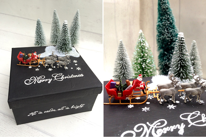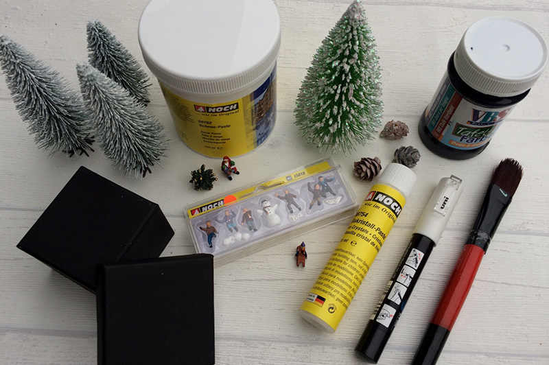 Das gewisse Extra kommt jetzt! Auf den Deckel der Schachteln malt man mit weißem Marker eine kleine Winterlandschaft und klebt die Miniatur-Weihnachtsfiguren auf. Solange der Kleber noch feucht ist, kann noch etwas Kunstschnee darüber gestreut werden. Größere Gegenstände, wie die Tanne, halten besser mit Heißkleber. Die kleinen Figuren können mit Kraft-oder Bastelkleber aufgeklebt werden.