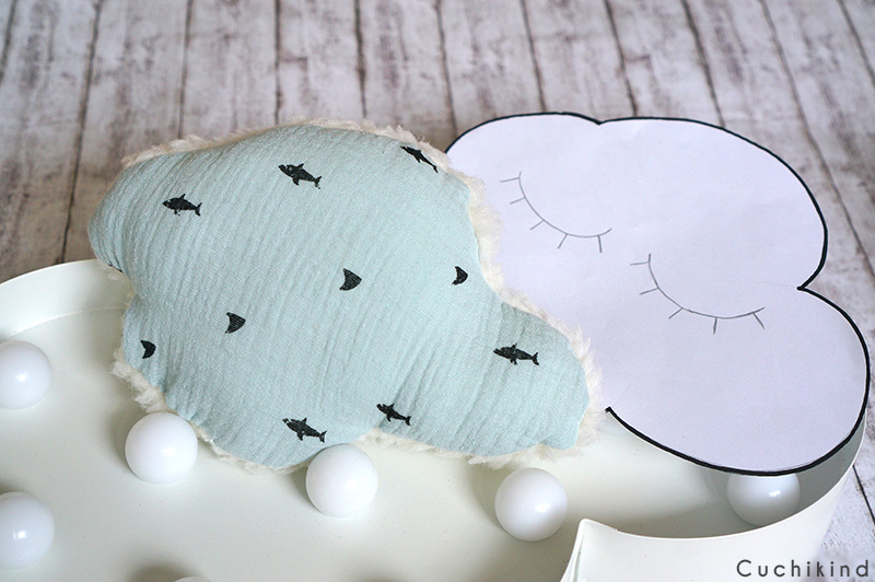 Zuerst haben wir eine Wolke auf Papier gemalt. Er den Umriss, ich die Augen. Diese hat er dann ausgeschnitten und mit einem Stoffstift auf Musselin und Teddystoff übertragen. Auch die beiden Teile hat er ganz alleine ausgeschnitten. Ich habe dann die Augen auf die Rückseite des Teddystoffes gemalt und ihm erklärt, was Sticken ist.