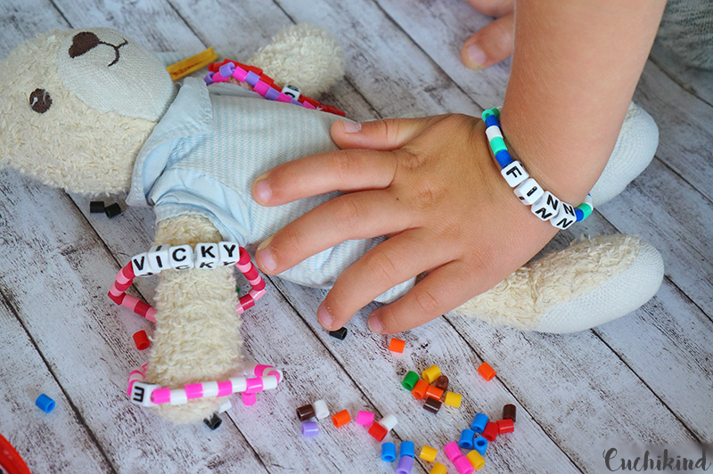 Oft sind die spontansten Sachen doch die Besten. Am Wochenende waren wir noch so mit der Wohnungseinrichtung beschäftigt, dass ich wieder nichts Neues gebastelt habe, obwohl ich gerade fürs Kinderzimmer so einige Ideen habe. Ich habe schon überlegt, ob ich heute überhaupt was poste und wenn ja, was. Aber wozu hat man denn Kinder. Nachdem Finn ein Legopäckchen* ausgepackt hat, in dem sich eine Mickey Mouse befand, wollte er ihr aus Bügelperlen ein Haus bauen. Ja, warum nicht? Beim Rausholen der Perlen sind mir die Buchstabenwürfel, die wir in den USA gekauft hatten, entgegen gefallen. Und schon wusste ich, was ich machen werde. Armbändchen für Finn und seine Kindergartenfreunde.
