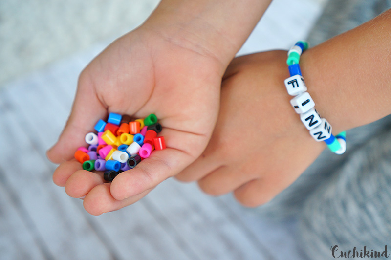 Passend für Mädchen und Jungs, haben Finn und ich die richtigen Farben für jedes Kind gewählt. Die Bügelperlen sind von Hama* und teilweise von Ikea. Worin sich die Hersteller unterscheiden, habe ich bei Snapchat mal für euch zusammengefasst (Nutzer: Cuchikind). Aufgefädelt habe ich die Buchstabenwürfel (Ähnliche hier*) auf einen dickeren Gummi. Diesen muss man am Ende nur zusammenknoten und die Kinder kommen schnell raus und rein.
