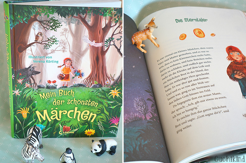 Mein Buch der schönsten Märchen“ vom Loewe-Verlag hat mich vom Cover her sofort angesprochen und da wir noch gar kein Märchenbuch zu Hause haben, kam es gerade richtig. Die Zeichnungen sind sehr süß, die Texte allerdings schwer zu verstehen. Ich würde es erst ab 5 Jahren empfehlen, Finn versteht viele Worte noch nicht. Das Buch enthält alle bekannten Titel und ist extra in der alten Sprache verfasst. Ich bin mir nicht sicher, ob ich es gut fände, wenn der Text modernisiert wird, irgendwie gehört das ja auch dazu. Wer also ein schönes Märchenbuch sucht, wird hier fündig.