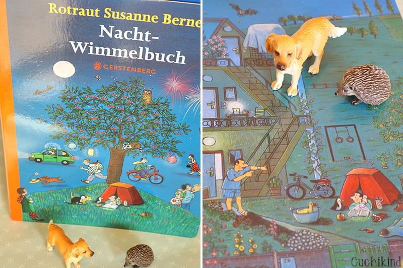 Jetzt kommen wir zu Finns Lieblingsbuch, das „Nachtwimmelbuch“ vom Gerstenberg-Verlag. Wir haben schon das Winter- und das Sommerwimmelbuch in der großen und der kleinen Variante und alle regen zum Suchen an. Auf der Rückseite der Bücher kann man sich eine Person oder ein Tier auswählen, das man dann durch das Buch verfolgt. Finns Favorit ist der Räuber, der am Ende von der Polizei gefangen wird. Ich finde toll, dass alle Bücher in der gleichen Umgebung spielen und man die Personen durch die Jahreszeiten, bzw. in der Nacht begleiten kann. Das Buch muss bei uns jetzt immer beim Essen liegen und wir suchen alle um die Wette.