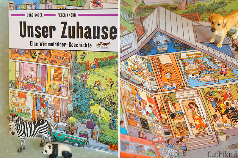 Das letzte Buch ist wieder ein Wimmelbuch, dieses Mal vom Beltz-Verlag. „Unser Zuhause“ ist so voller Action, dass man ewig an einer Seite sitzen kann ohne dass einem langweilig wird. Das Interessante ist, dass man die einzelnen Häuser mehrerer Familien sieht, die kreisförmig angeordnet stehen. So sieht man alle Gebäude von vorne und hinten. Die Bewohner besuchen sich gegenseitig, feiern Parties und schicken ihre Kids in die Kita. Real life.