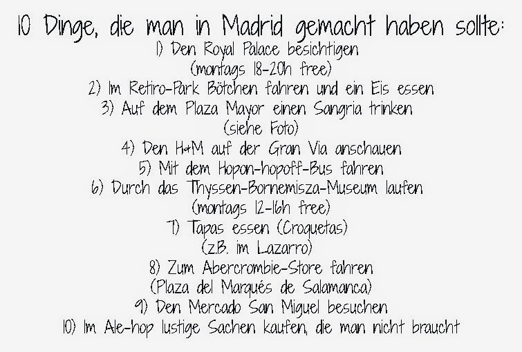Madrid liegt mitten in Spanien und deshalb nicht am Meer, trotzdem hat die Stadt viel zu bieten. Was ihr (meiner Meinung nach!!!) unbedingt gemacht haben solltet, habe ich mal für euch zusammen gefasst: