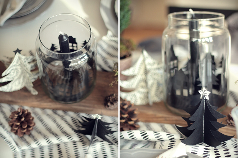 Für das Windlicht habe ich aus schwarzem Karton eine kleine Häuserfront ausgeschnitten und sie von Innen an einer Glasvase befestigt. Hier ist eurer Phantasie natürlich keine Grenze gesetzt.