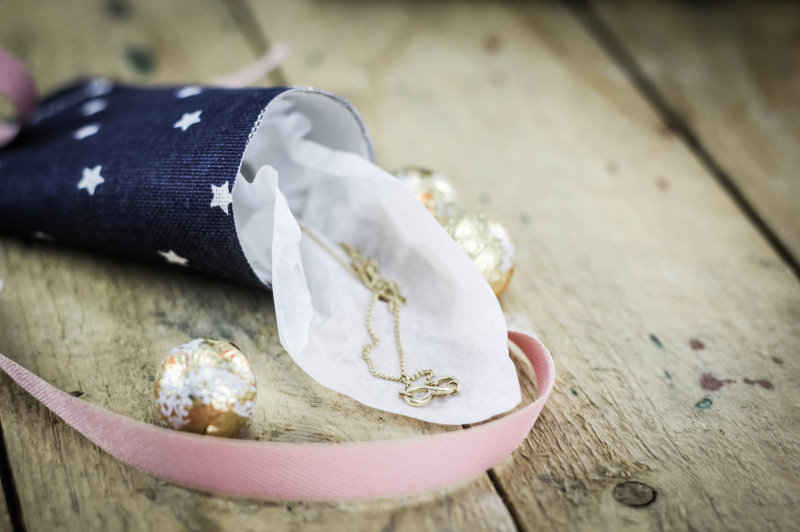 Jetzt kann die kleine Box schon befüllt werden, ich habe die Geschenke zusätzlich noch mit etwas Seidenpapier umwickelt. Als Nächstes wird auch die zweite Seite geschlossen, dazu die Seiten im 90°C Winkel zu der bereits geschlossenen Seite zusammendrücken und sie ebenfalls zusammennähen.