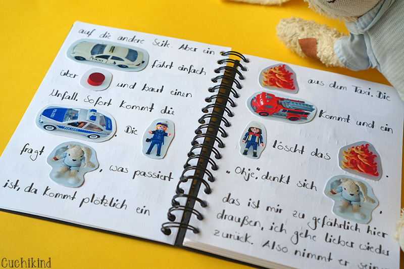 Ich habe ein kleines Ringbuch genommen und die Geschichte einfach hineingeschrieben. Einen kleinen Ausschnitt sehr ihr hier. Die Story ist nicht sonderlich kreativ, aber Finn macht das gar nichts, er wollte die Geschichte gleich noch mal lesen 😉