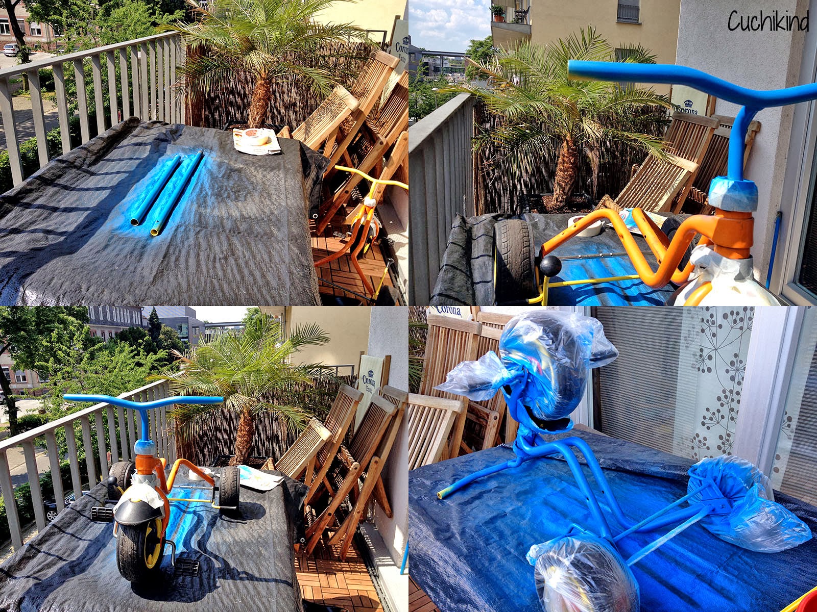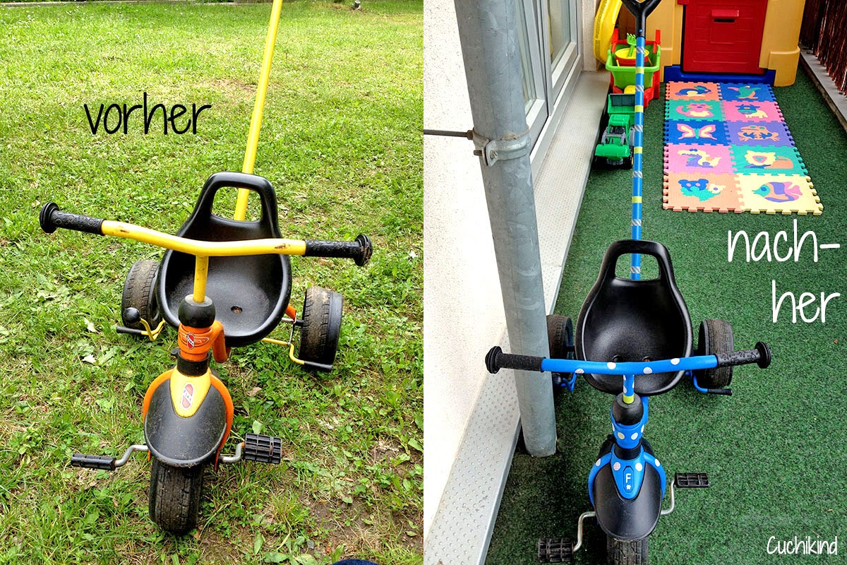 Heute zeige ich euch, wie ihr ganz einfach ein altes Dreirad aufhübschen könnt. Wir haben das Dreirad geerbt und es entsprach farblich nicht ganz Finns Vorstellungen (habe seinen Gesichtsausdruck so interpretiert ;-)), außerdem war es ziemlich rostig. Nachdem ich es erstmal gereinigt habe, haben wir es soweit es ging auseinander gebaut. Und dann ging es zum Dreirad upcycling.