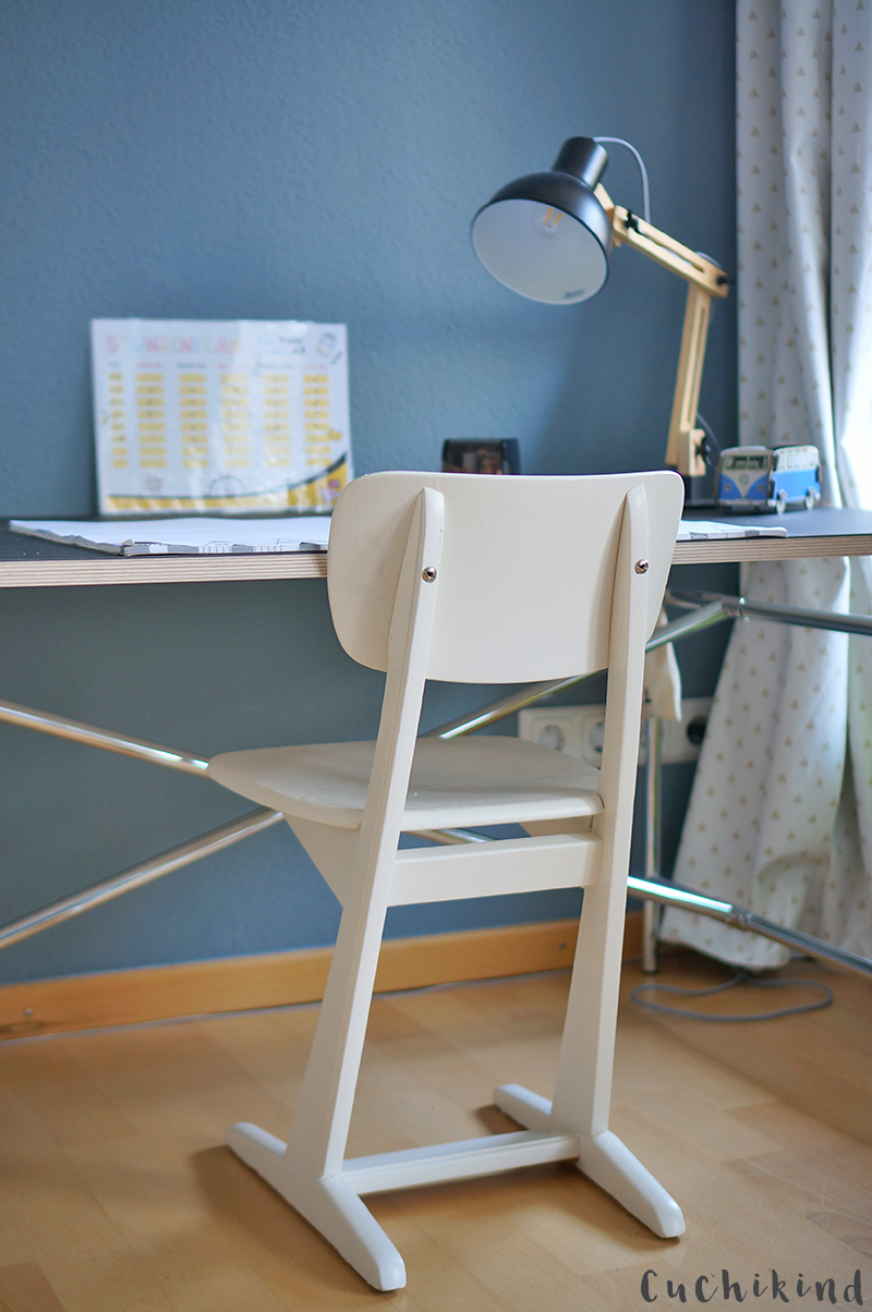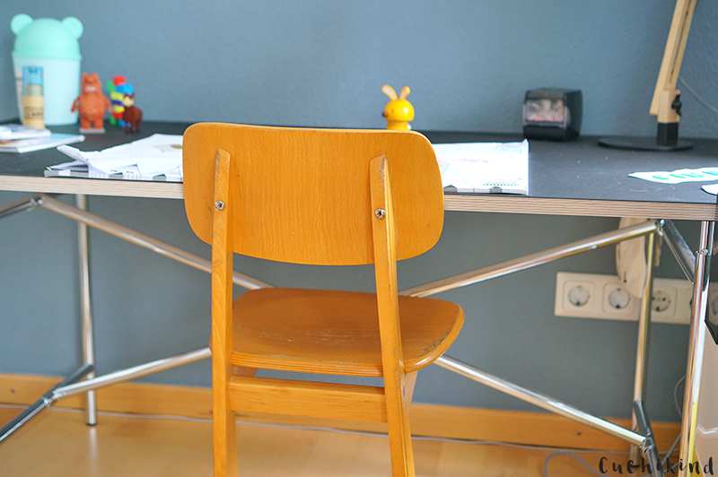 Ich wollte ja schon immer so einen süßen, alten Schulstuhl haben. Ich hatte auch bereits öfter bei Onlineanzeigen geschaut. Da war aber nie das Richtige dabei. Lustigerweise war genau jetzt einer im Angebot, der nur 20 Euro kosten sollte und direkt bei uns um die Ecke stand. Nicht lange gefackelt, gleicht gekauft und für gut befunden. Die Größe ist für Finn auf jeden Fall perfekt.