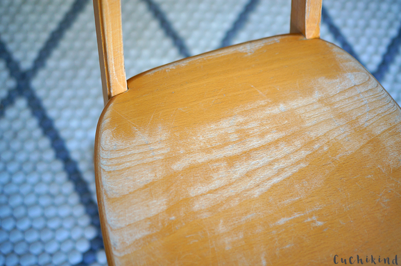 Nur die Farbe passte jetzt nicht so richtig gut zum Rest. Aber das lässt sich ja schnell ändern. Zuerst haben wir den Stuhl ordentlich abgeschliffen, weil die Farbe sonst nicht ordentlich haftet und nachher abbröckelt. Vor allem, da der Stuhl vorher lackiert und somit viel zu glatt war.