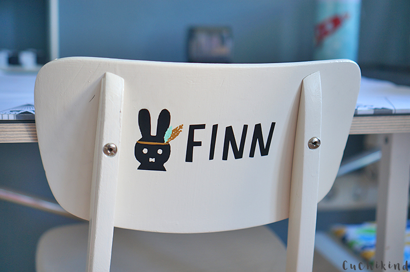 Als letztes habe ich noch den Indianer-Hasen meines Headers mit einer hübschen Schrift in das Plotterprogramm geladen, zu einer Vektordatei verwandelt (das macht das Plotterprogramm) und mit dem Plotter (ich habe diesen von Silhouette (Amazon Partnerlink)) ausgeschnitten. Ich habe schwarze Tafelklebefolie benutzt und goldene und mintfarbene Shirtfolie, weil ich nichts anderes da hatte. Am besten ist aber normale Plotter-Klebfolie. Aufkleben und fertig ist der personalisierte Schreibtischstuhl. Das Praktische ist, dass man es ganz einfach wieder abmachen und aktualisieren kann, falls es nicht mehr gefällt. Auch umstreichen ist bei der weißen Farbe kein Problem.