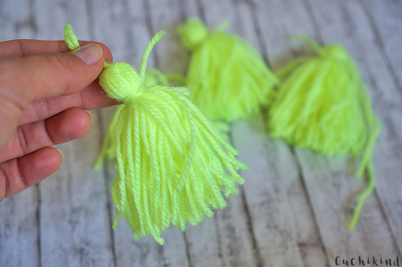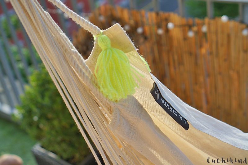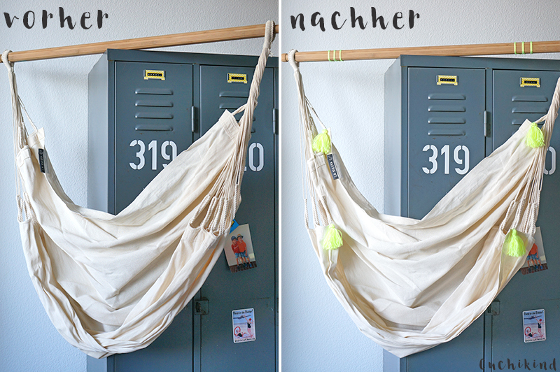 Der Hängestuhl sieht auch so schon mega aus, aber wer mich kennt, der weiß, bei uns bleibt selten was wie gekauft. Ich habe mich für Quasten in neongelb entschieden, weil die auch schon an der Babyschaukel (Anleitung kommt noch) hängen und so schön sommerlich aussehen.