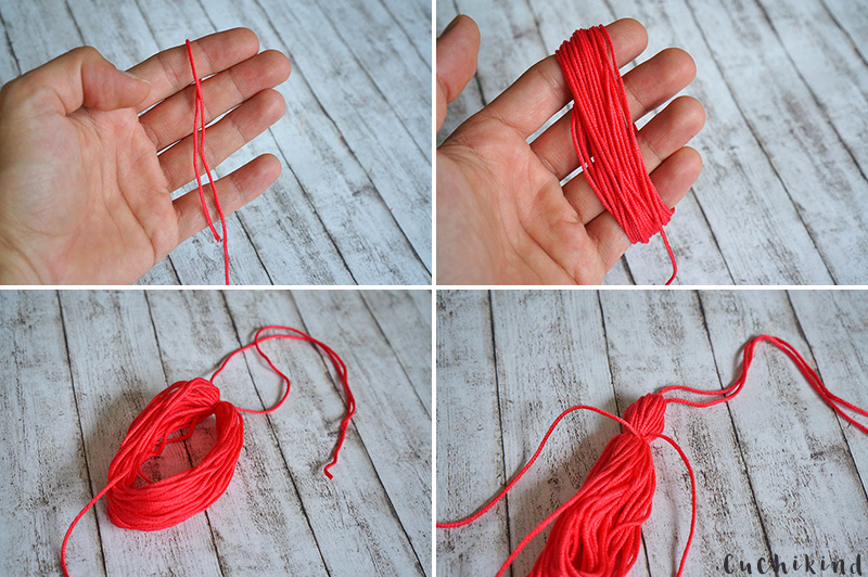 - Schiebe die Fäden vorsichtig von deiner Hand und knote sie oben mit einem neuen Faden fest.