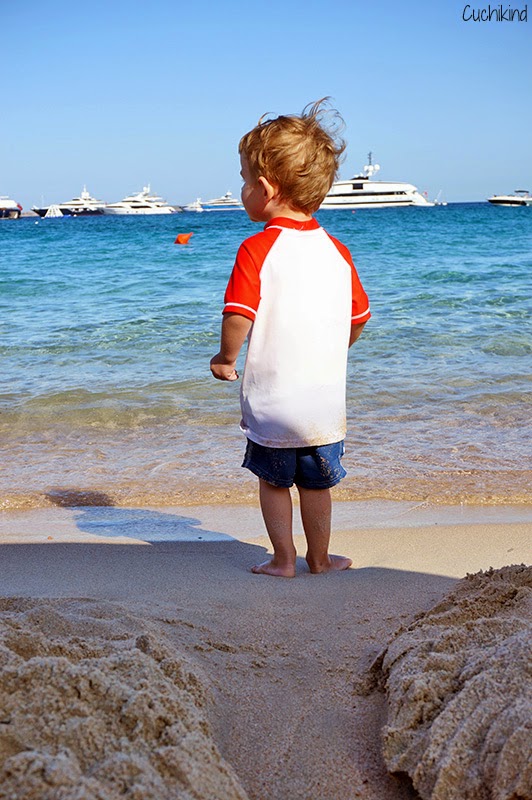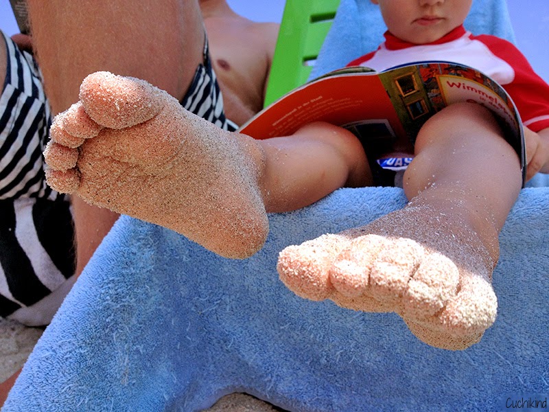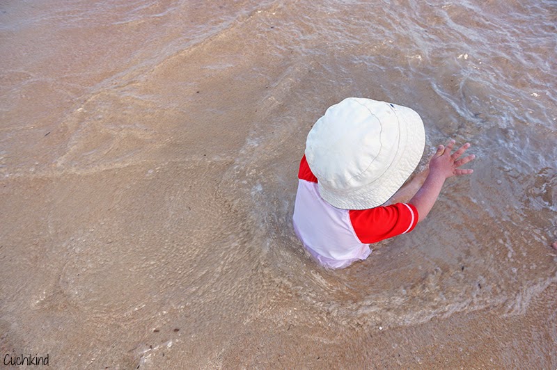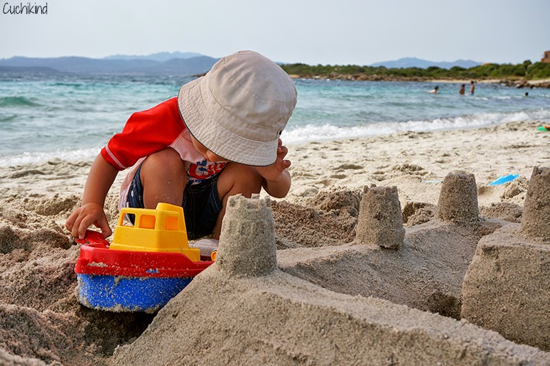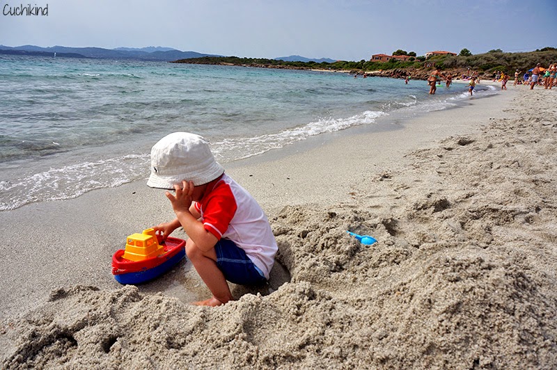 Anders als der Spiaggio di Ruja liegt dieser Strand in einer Steinbucht. Dies hat den Vorteil, dass es einen Bereich gibt, in dem das Wasser ganz flach und ruhig ist, wie ein Babybecken. Das fand Finn prima. Auch hier ist das Wasser superklar und schön türkis, der Sand ist ein bisschen grober. Ein Imbiss mit Toilette ist vorhanden. Parken ist hier eher schwierig. Wir kamen recht früh und haben einen der letzten Parkplätze direkt am Hotel oben gefunden. Dann läuft man noch ein ganzes Stück nach unten zur Bucht. Und das mit einem Kind, das natürlich gerade dann nicht laufen möchte, drei Sonnenschirmen, zwei Stühlen, Picknickdecke, zwei Taschen, Kinderrucksack und Schwimmnudel. Uiuiui. Sonnenschirme und Stühle konnte man übrigens kostenfrei im Hotel leihen.