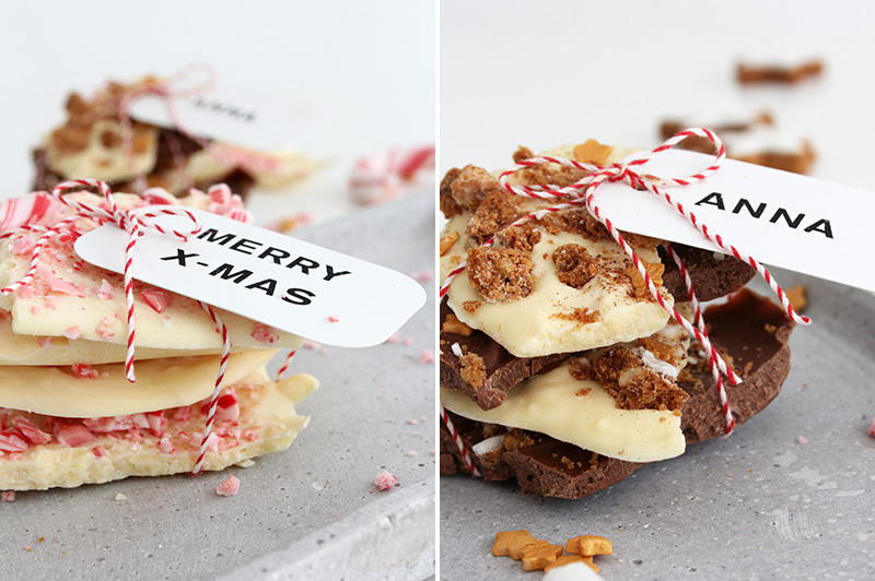 Die rot-weißen Zuckerstangen sehen auch zerbröselt super dekorativ aus. Bei der Zimtstern-Schocki habe ich zusätzlich ein paar Zuckersterne zur Deko drüber gestreut. Falls ihr es auf die Spitze treiben wollt, könnt ihr auch zusätzlich noch etwas Zimt drauf streuen. Oder wie wäre es mit einer Variante mit Spekulatius?