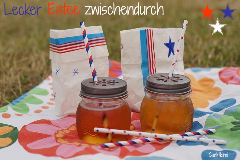 Den kompletten Vormittag habe ich damit verbracht, einzukaufen, Frikadellen zu machen, Brötchen zu belegen, Eistee zu brauen, Früchte zu schnippeln, Schokoglasur zu verteilen und Deko zu basteln. Die Frikadellen bestehen nur aus 500g Hackfleisch, einer kleinen Zwiebel, einem Ei, einem Teelöffel Senf und einem eingelegten Brötchen. Die Burger habe ich mit Salat, Essiggurke, Senf, Ketchup und Frikadelle belegt und die Brötchen vorher kurz in den Backofen geschoben. Tatsächlich schmeckten sie auch kalt wirklich gut.
