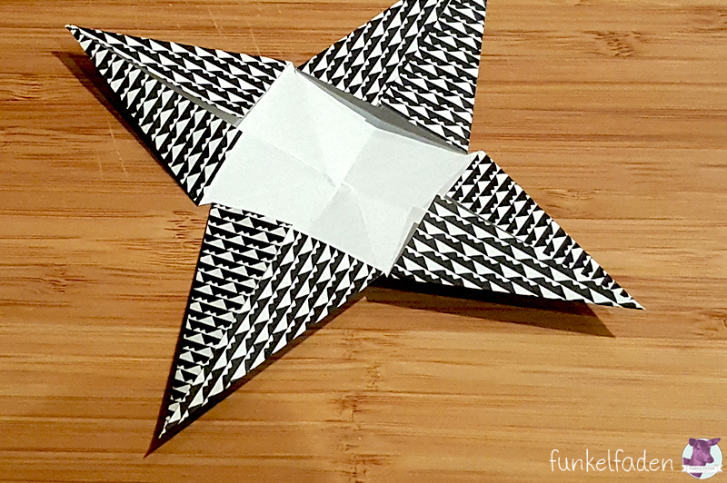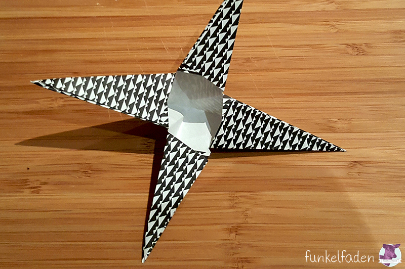Wir benötigen zwei quadratische, gleich große Papiere. Das Papier wird diagonal zum Dreieck gefaltet. Danach wird das Dreieck zu einem kleineren gefaltet. Dieses wird nun mittig zur Spitze gehend bis zur Hälfte eingeschnitten. Nun wird das Papier wieder aufgefaltet. Die eingeschnittenen Seiten werden alle acht jeweils zur Falz gefaltet. Dann wird auf eine Seite Klebstift geklebt und die Spitzen werden ineinander geschoben und von innen zusammengedrückt. So erhält der Stern seine plastische Form.