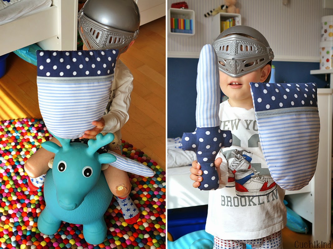 Finn kommt jetzt langsam in das Alter, in dem er Ritter, Piraten und Cowboys super findet. Ich persönlich bin kein Fan von Holz- oder Plastikwaffen, wenn überhaupt, und hatte ihm schon vor zwei Jahren ein Schwert genäht, mit dem man wirklich niemanden verletzen kann. Durch Zufall habe ich jetzt am Wochenende sogar noch einen Ritterhelm ergattern können und mit dem neuen Ritterschild ist er komplett. Wie ihr seht, hat er auch schon das passende Pferd gefunden 😉