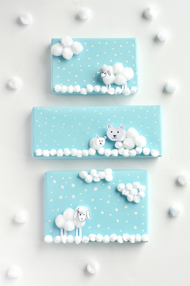 2 – Schafkörper aus 4-5 Pompons (die größere Größe) mit Heißkleber auf das Geschenk kleben