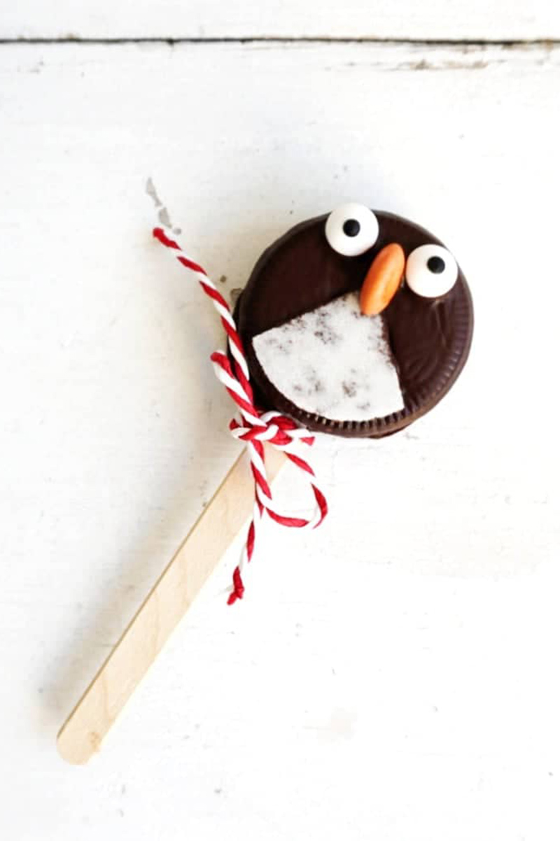 Für den Schnabel des Pinguins zuerst ein Smartie halbieren und dann auf den Keks drücken. Der weiße Bauch besteht jeweils aus einer zugeschnittenen Oblate, die ihr ebenfalls auf den schokoüberzogenen Keks drückt. Nun nur noch die Zuckeraugen anbringen und eure Oreo Pops dann im Kühlschrank aushärten lassen.