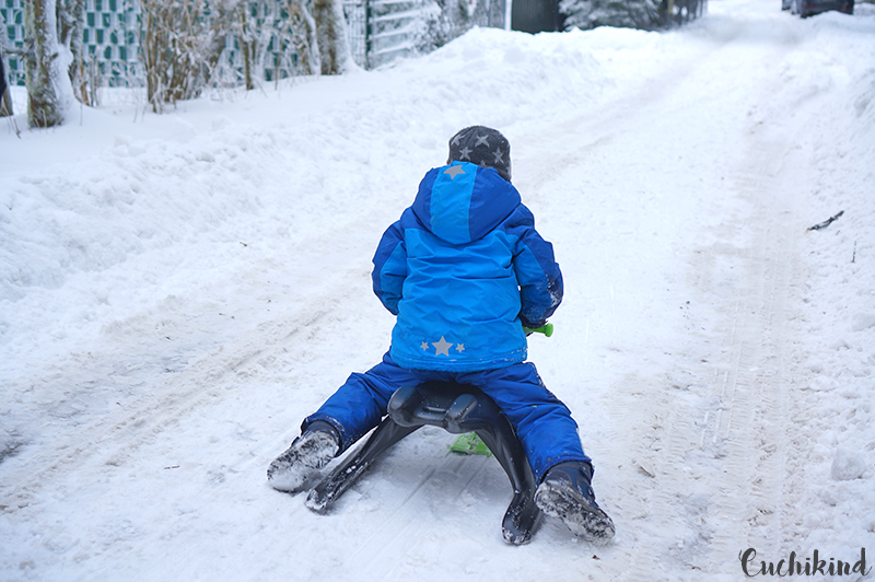 Außer Mütze und Schal, die wir mal bei Zara gekauft haben, ist alles von Tchibo. Lange Unterhose, Schneeanzug und Schuhe sind super. Wir tragen den Anzug sogar schon den zweiten Winter. Wichtig ist für mich bei Schneehosen einmal die Hosenträger und unten ein Gummizug, um ihn über die Schuhe zu ziehen. So kann wirklich kein Schnee durchkommen.