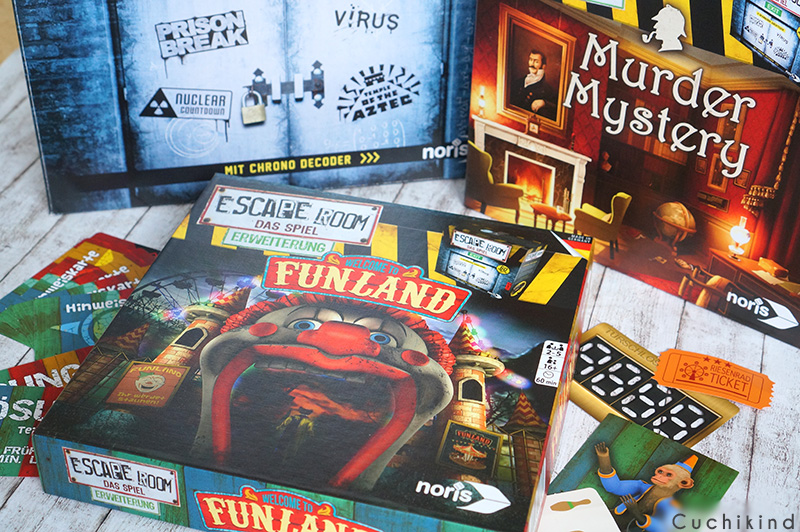 Es gibt ja verschiedene Firmen, die sowas anbieten, aber die von Noris sind mit Abstand die Kreativsten. Wir haben schon die vier Abenteuer des Grundspieles bewältigt, genauso wie die Erweiterung „Funland“. „Murder Mystery“ steht noch aus. Wir trauen uns nicht richtig dran, da dies einen hohen Schwierigkeitsgrad hat und wir schon bei den anderen das ein oder andere Mal auf dem Schlauch standen, aber wir werden das auch noch schaffen.