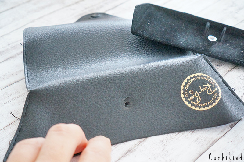 Das hier ist meine Sonnenbrille und mein altes Etui. Wie ihr sehen könnt, reißt das Leder vorne am Knopf schon aus. Weil es sowieso kaputt ist, habe ich es komplett auseinander genommen, um das Schnittmuster perfekt anpassen zu können. Dieses könnt ihr euch hier herunterladen: