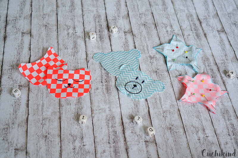 Bei Katze und Bär habe ich jetzt noch ein Gesicht mit einem Stoffstift aufgemalt und das mit schwarzem Garn bestickt. Dann werden die zwei passenden Teile mit den schönen Stoffseiten nach innen aufeinander gelegt und festgesteckt.